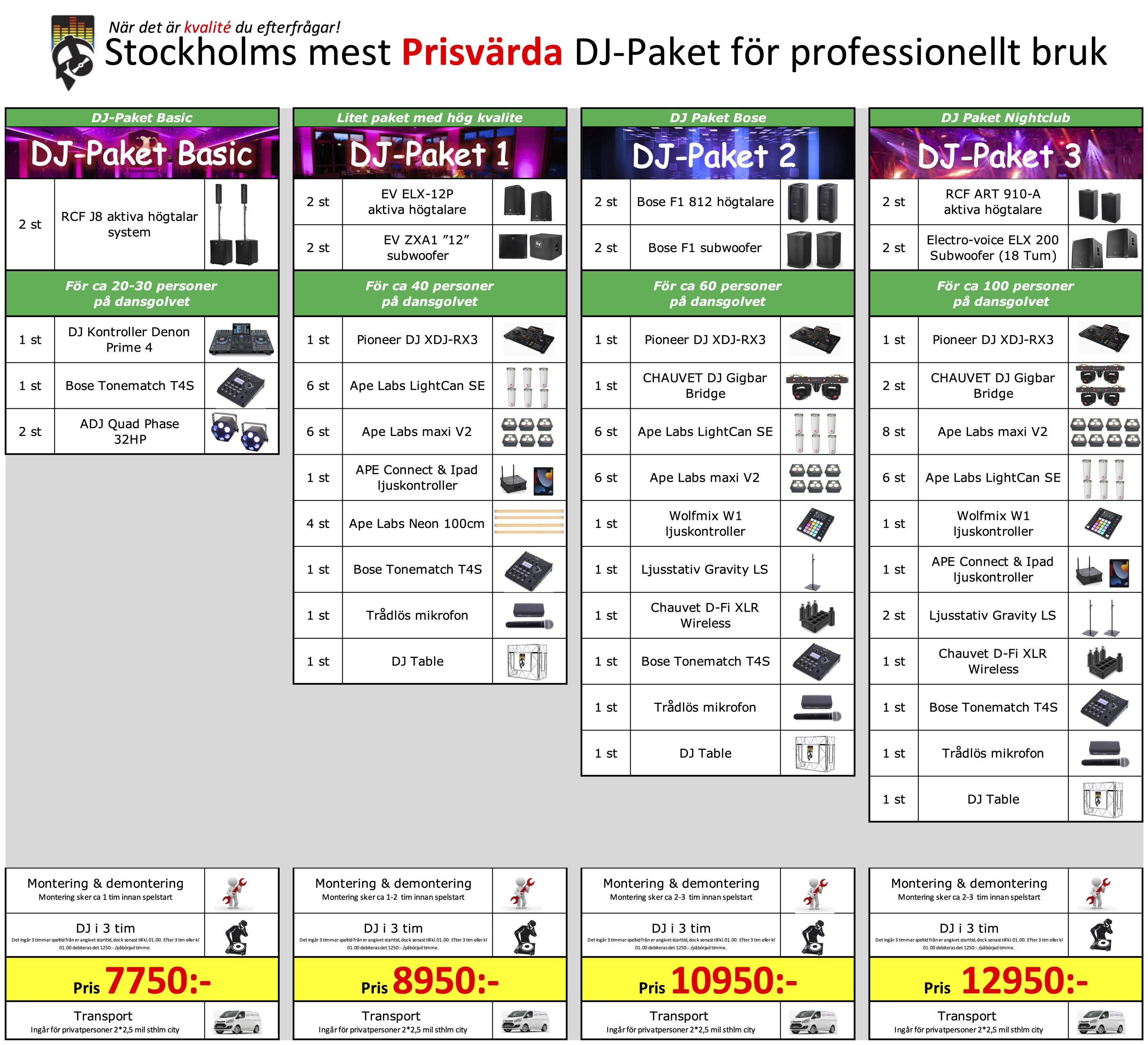 Våra priser baseras på vilken typ av utrustning som ingår i de olika DJ-paketen.