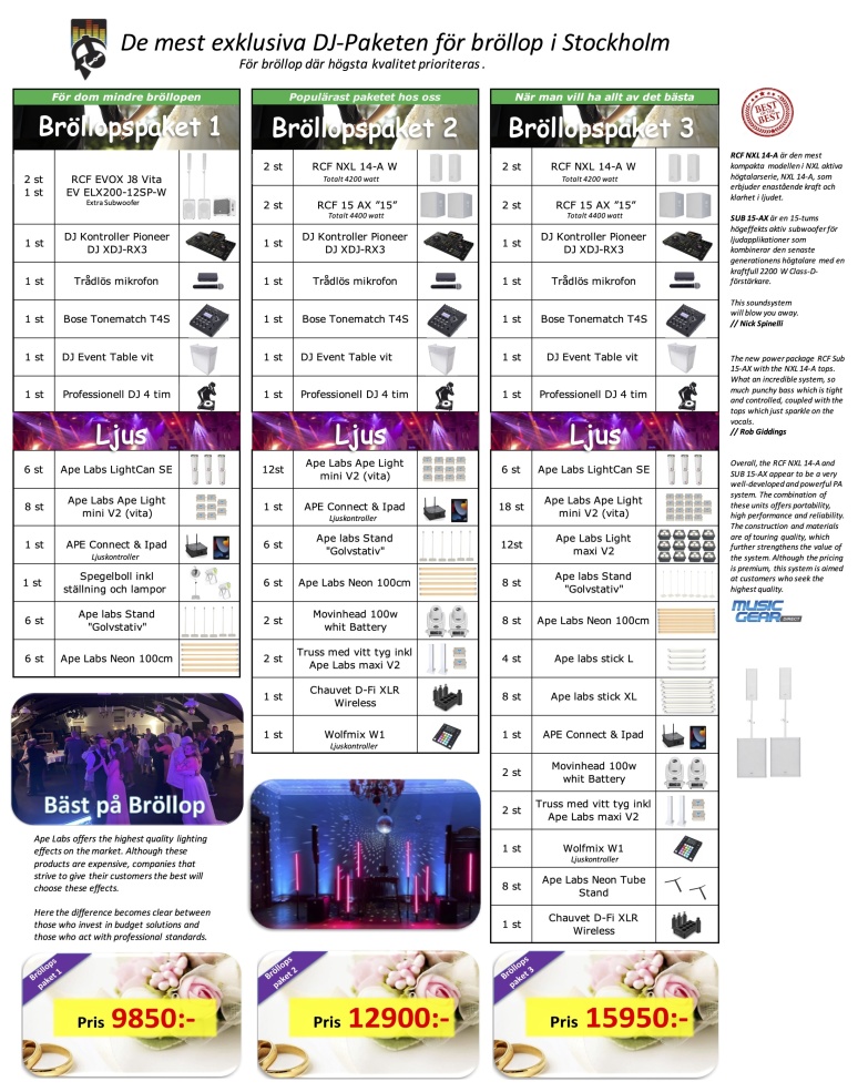 .(Bröllopspaketet omfattar ljudutrustning i vitt, medan DJ-paketen har ljudutrustning i svart.)